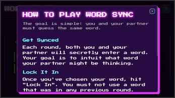 The first pair to enter the exact same word (100% sync) wins the game! You only have 10 rounds to achieve a sync, otherwise the game is over. Good luck, and get in sync!